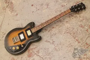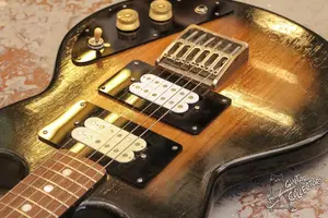 Ольховый даблкат с парой хамбов и струнами сквозь корпус. На удивление приятный и хорошо звучащий инструмент с длинющим сустейном. Технически в полном порядке, гриф ровный, струны низко, строй держит. Косметически для своег овозраста в хорошем состоянии. серьезных повреждений не наблюдается. Датчики заменены на сет неопознанных хамбов, колки заменены на grover.