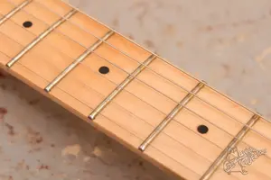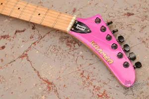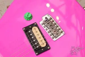 Яркий харизматичный суперстрат из махагона с кленовой накладкой и одним датчиком. Технически в порядке, все звучит и строит. По косметике один подкрашенный скол, в глаза не бросается. Установлен костяной порожек и колки заменены на получше.