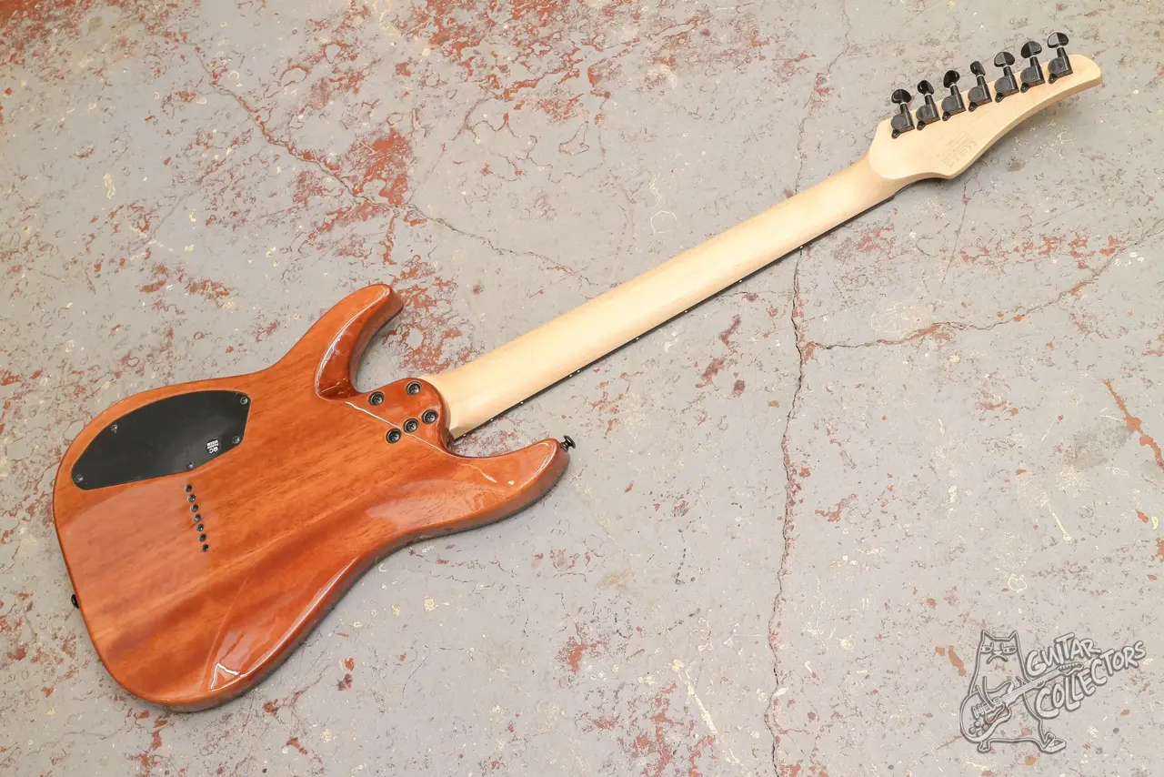 Симпатичный семиструн из махагона с красивым топом из капа тополя, накладкой из венге, парой мощных хамбов с отсечками и струнами сквозь корпус. Технически и косметически в очень хорошем состоянии, все звучит и работает, повреждений не наблюдается, только следы эксплуатации.