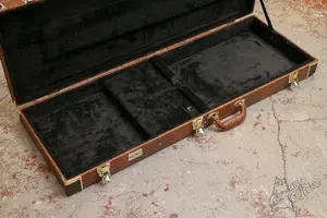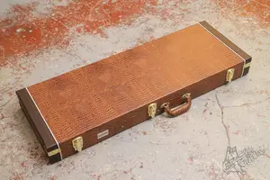 Симпатичный деревянный кейс с обивкой под змеиную кожу. Влезают страты, суперстраты, можно поместить даже ЛП, но будет задевать дно головой.
