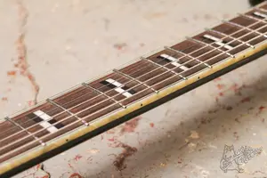 Редкий и самобытный Les Paul с парой мощных хамбов с отсечкой, удобной пяткой и красивой перламутровой окантовкой по корпусу и грифу. Увесистая взрослая машина для тяжелых стилей. Инструмент в хорошем состоянии, сколов нет, только следы эксплуатации и потертости. Все родное кроме крышки анкера. Была трещинка по лаку в районе пятки, но она именно по лаку поперек грифа ровной линией, сделан косметический ремонт, место покрыто лаком в цвет, видно только при хорошем освещении под определенным углом. По дереву никаких трещин ремонтов не было.