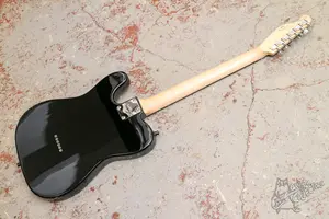 Черный телек с рельсовым минихамбом в бридже и струнами сквозь корпус. Технически все прекрасно, отстроено и работает. Косметически без повреждений. Бридж заменен на более качественный с латунными седлами, бриджевый датчик заменен на рельсовых минихамб, ручки потцев также стоят более симпатичные. По сборке удачный экземпляр.