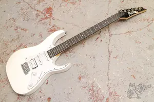 Белый суперстрат с 24 ладами, HSS набором датчиков и двухболтовым тремоло. Все звучит и строит, вложений не требует. Косметически без происшествий.