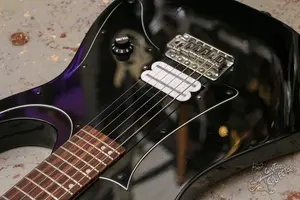 Черный суперстрат с одним рельсовым хамбом.Технически в порядке, гриф ровный, по ладам все звучит вложений не требует. По косметике есть пара маленьких сколов, по дереву без проблем. Установлен пикгард под один хамб и рельсовый керамический хамбакер, звучит адекватно, выглядит стильно. Установлены стреплоки.