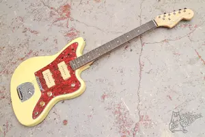 Яркий джазмастер с парой P90 и тремоло бриджем. Технически в полном порядке, сборка адекватная, гриф ровный, анкер работает, звучит, строй держит. По косметике без повреждений, в эксплуатации инструмент практически не был.