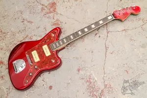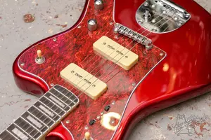 Яркий джазмастер с парой P90, 22 ладами, окантовкой по грифу и инкрустацией прямоугольниками. Технически в полном порядке, сборка адекватная, гриф ровный, анкер работает, звучит, строй держит. По косметике без повреждений, в эксплуатации инструмент практически не был.
