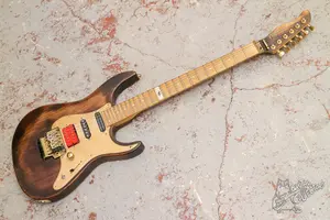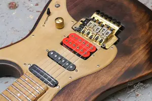 Подписная модель Ken Kitamura L’Arc-en-ciel, полностью кленовый страт с хамбом в бридже, 24 ладами, отсечкой на оба хамба, реверсивной телековской головой и флойдом. Технически в порядке, все исправно. Изначально модель целиком в красном лаке, и гриф и накладка и голова, все красное, Один из предыдущих владельцев не выдержал и снял весь лак. Все родное кроме некового датчика, стоит рельсовый минихамб belcat с отсечкой, и по мелочи родно чедло на флойде заменено. Также пикгард стоит выпиленный из цельного куска деревяшки, не фанера, так что он как цельный топ на акустике добавляет правильных вибраций. А если серьезно то в хорошем состоянии эта модель уходит в районе 50к, здесь технически все в порядке, но с учетом косметики ценник почти в два раза ниже.
