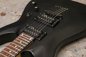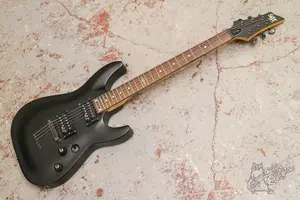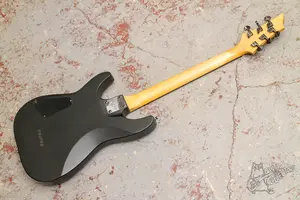 Матовый суперстрат с фигурным топом, парой мощных хамбов и струнами сквозь корпус. По гриф у все звучит, струны низко, анкер работает, проблем не наблюдается. Косметически без сколов, только небольшие потертости и коцки по лкп..
