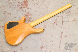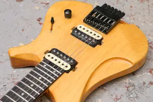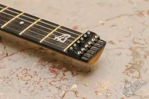 Легкий компактный безголов из ольхи с вклееным грифом, эбони накладкой и отсечками на оба датчика (пуш-пуш). Удобный и сбалансированный инструмент. Технически в полном порядке, все строит и звучит. Косметически без происшествий. Мастер Александр Зараменских.