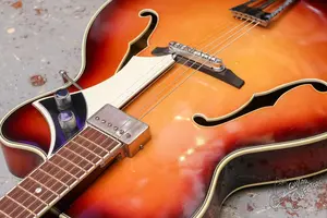 Харизматичная джазовая банка с датчиком. Инструмент был полностью отреставрирован и доведен до прекрасного технического состояния. Колки заменены на новые gotoh, установлены новые лады, также установлен магнитный звукосниматель Lоuis, снятый с японского СооlZ lеs раul, установлен без фрезеровки корпуса, распайка стандартная громкость и тон, сделаны в пикгарде, так же без каких-либо лишних отверстий в деке.Не смотря на почетный возраст, инструмент выглядит и звучит крайне бодро, на нем вполне и пост панк навернуть можно и джаз. Про данную модель и одноногого мастера создавшего ее есть много информации в интернетах.