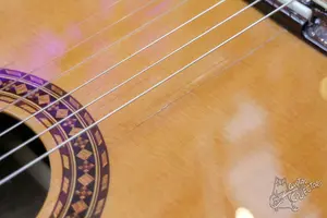 Классическая гитара с топом из массива. Инструмент новый, на складе появилась трещина в верхней деке от перепада влажности. Трещина была надежно заклеена, опасности не представляет. В эксплуатации гитара не была, других повреждений нет, по грифу и ладам все хорошо.