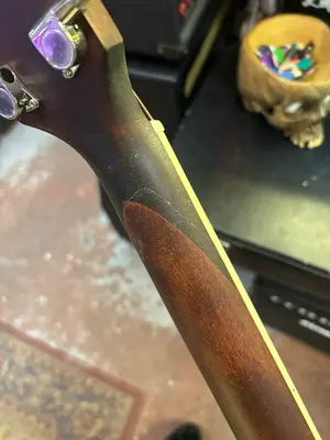 Акустический дредноут. Техничсеки все прекрасно, звучит и строит, в эксплуатации инструмент не был. На складе поставщика получил трещинку в районе головы (целиком не отваливалась), она была надежно подклеена, никакой опасности не представляет, на звук не влияет, момент косметический.