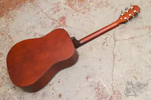 Акустический дредноут. Техничсеки все прекрасно, звучит и строит, в эксплуатации инструмент не был. На складе поставщика получил удар в нижней части корпуса, трещина была надежно подклеена, никакой опасности не представляет, момент косметический.