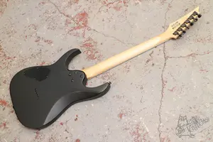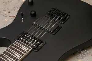 Черный матовый суперстрат со струнами сквозь корпус 24 ладами, кантом по грифу и парой хамбов. Технически все хорошо, строит и звучит. Косметически небольшие потертости и пара вмятинок по лкп. Голова закрашена в черный матовый, нековый датчик заменен на хамбакер schecter, в остальном все сток.