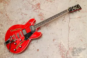 Вариация на тему ES-335. Кленовая банка с сустейн блоком из махагона, тремоло системой типа bigsby и локовыми колками. Технически в полнмо порядке, все строит и звучит. Гитара была довольн осильно прокачена, установлено тремоло, установлены локовые колки guyker, датчики заменены, стоят хамбы с корейского GrassRoots. Косметически без сколов, только трещинки по лаку.
