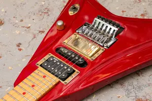 Яркая японская стрела с надежным флойдом Gotoh, HSH сетом адекватных датчиков, ольховым корпусом с фигурным топом и кленовой накладкой. Подписная модель Panther из Cycle. Техничсеки все хорошо, гриф ровный, струны низко, лады с запасом. По косметике без сколов, даже рога целые, только потретсоти и царапинки по лкп. Распайка сделана на 3-х поз переключатель и потенциометр громкости пуш-пулл, который включает сингл. Датчики заменены на fokin brown horse в неке, tesla opus 4 в бридже, и в мидле сигл belcat. Флойд стоит свежий и надежный Gotoh 1996t.