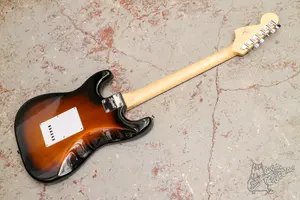 Cкваер c большой головой, тремя синглами и шестиболтовым тремоло. Инструмент в хорошем техническом состоянии, все исправно, гриф ровный, лады с запасом. По косметике без сколов, только потертсоти и следы эксплуатации. Распайка изменена на одну громкость и один тон, чтобы ручка громкости не мешала при игре. Это редкая версия аффинити страта, которая продавалась только в комплекте с комбиком. Все родное кроме колков. Маленький свитч включает нековый датчик, то есть в нековой позиции переключатля датчиков он работает как киллсвитч, а в других добавляет нековый сингл.