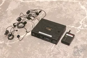 Комплект на фото, премник, передатчик и три головных микрофона.