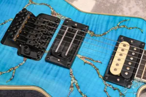 Симпатичная копия вашбурна с толстой окантовкой, роскошной инкрустацией и вклеенным грифом. Технически и косметически без проблем, гриф ровный, анкер работает, флойд сейчас настроен, если его не дергать агрессивно, то держать он способен. В эксплуатации инструмент не был.