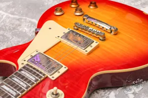 Тяжеленький стандарт с красивым кленовым топом и отсечками на оба хамба. Технически без нареканий, гриф ровный, все родное, все исправно, струны низко, по ладам все звучит. Косметически имеется пара сколов на корпусе. Голова ломалась, заклеена надежно, как и всегда в таких случаях, второй раз в томже месте не сломается, на звук не влияет. В данном случае сломалась она хорошо (ремонтопригодно), не отсеклась ровно поперек, а имеет пртяженность от порожка до колков, а это значит что место ремонта имеет большую площадь контакта, так что все надежно держится.