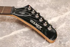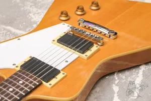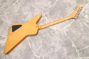 Эксплорер из корины с вклеенным кленовым грифом, окантовкой по корпусу и сетом активных EMG. Технически в полном порядке. гриф ровный, все строит и звучит. Косметически сохранился хорошо, сколов нет, только коцки и следы эксплуатации. Все родное кроме датчиков. В комплекте чехол по форме.