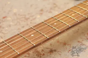Матовый черный телек с фигурным топом, парой хамбов с отсечками и струнами сквозь корпус. Технически в полном порядке, гриф ровный, струны низко, все звучит и работает. Косметически без происшествий, только потертости по лаку.