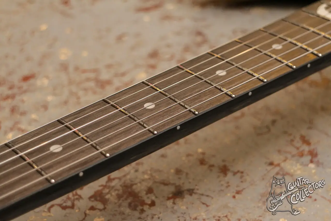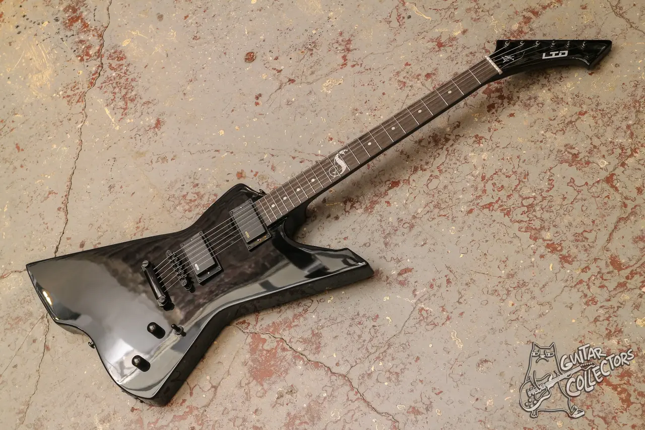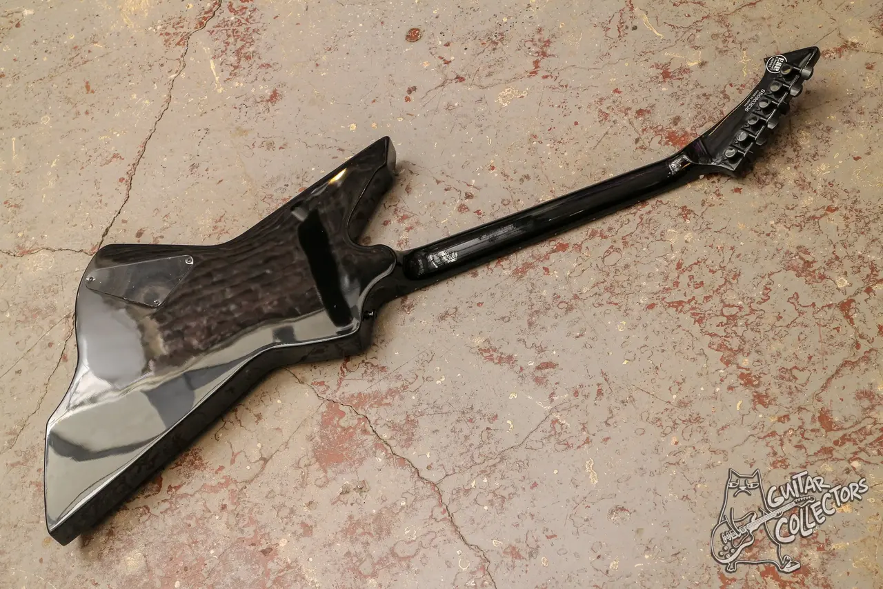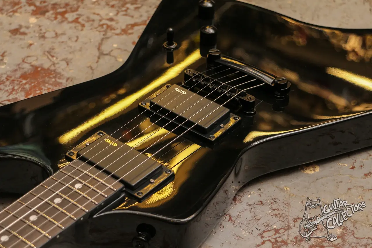 Черный эксплорер с вклеенным грифом. Копия гитaры ЕSР, фpoнтмeна Меtalliсa. Технически и косметически все хорошо, по сборке без проблем, все ровно, звучит и строит. Датчики здесь пассивы с надписью емг.