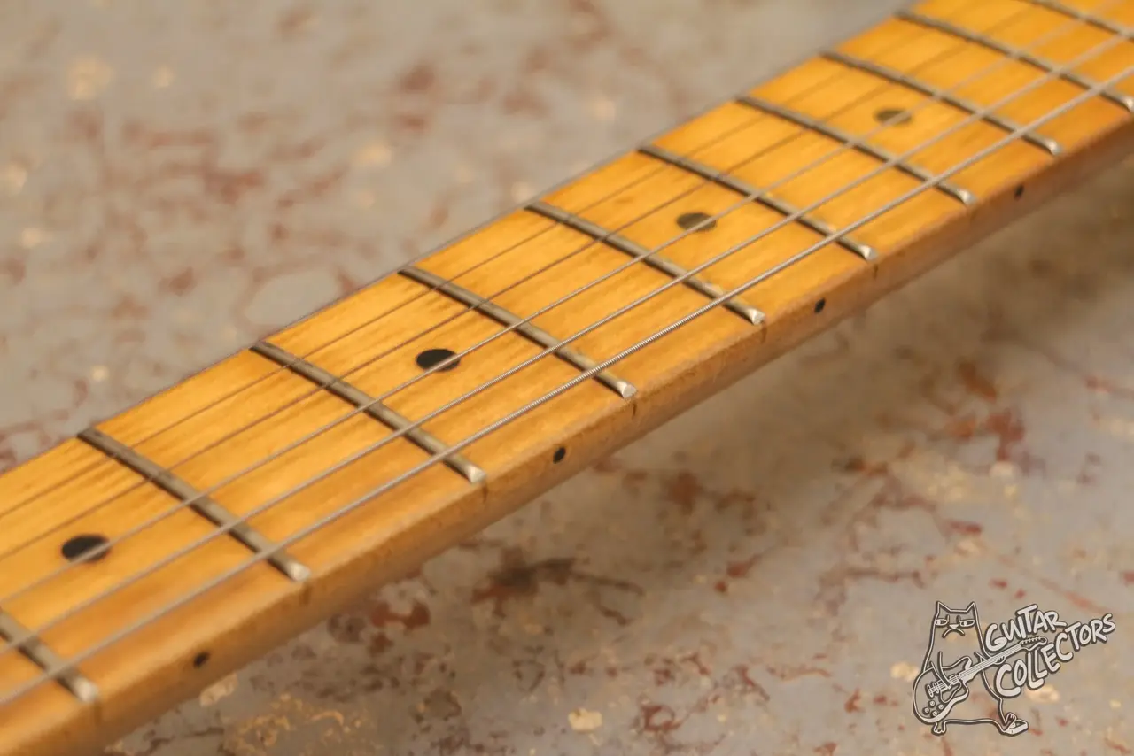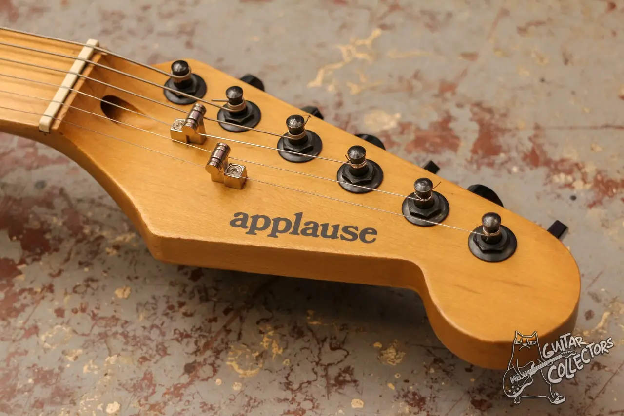 Корейский страт с кленовой накладкой, HSS набором датчиков с отсечкой и шестиболтовым тремоло. Технически в порядке, гриф ровный, строй держит. Косметически без сколов, только потертости и следы эксплуатации. Вся фурнитура и датчики родные.