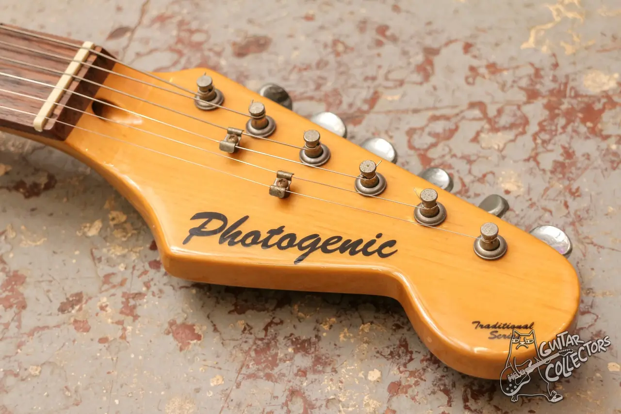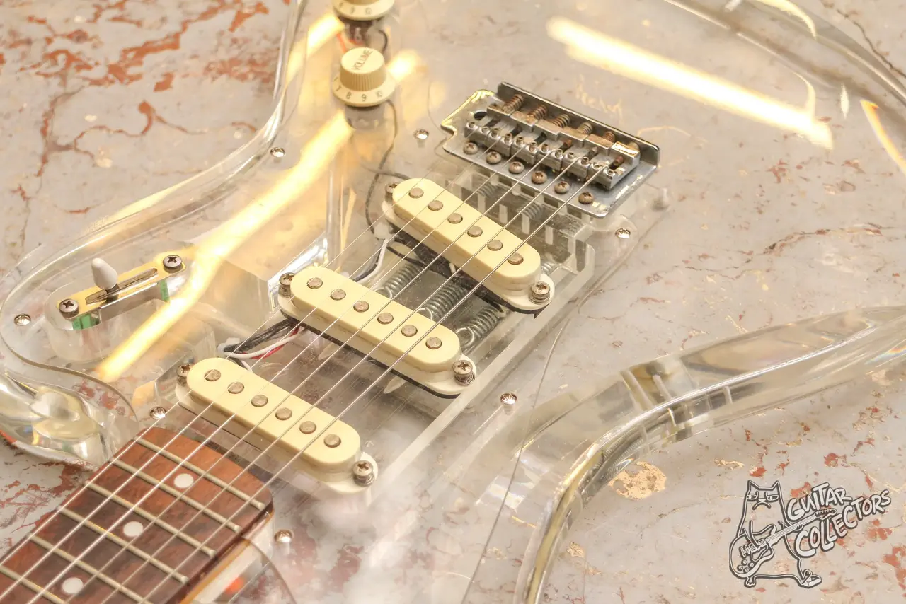 Прозрачная акриловая яга с тремя синглами и шестиболтовым тремоло. Технически состояние хорошее, все родное, звучит и строит. Косметически имеются потертости и небольшая трещинка в кармане грифа, но так как каорпус прозрасный, ее видно и она там совсем не глубокая, опасности не представляет. Инструмент такой же интересный и редкий, как и тяжелый (5.5кг).