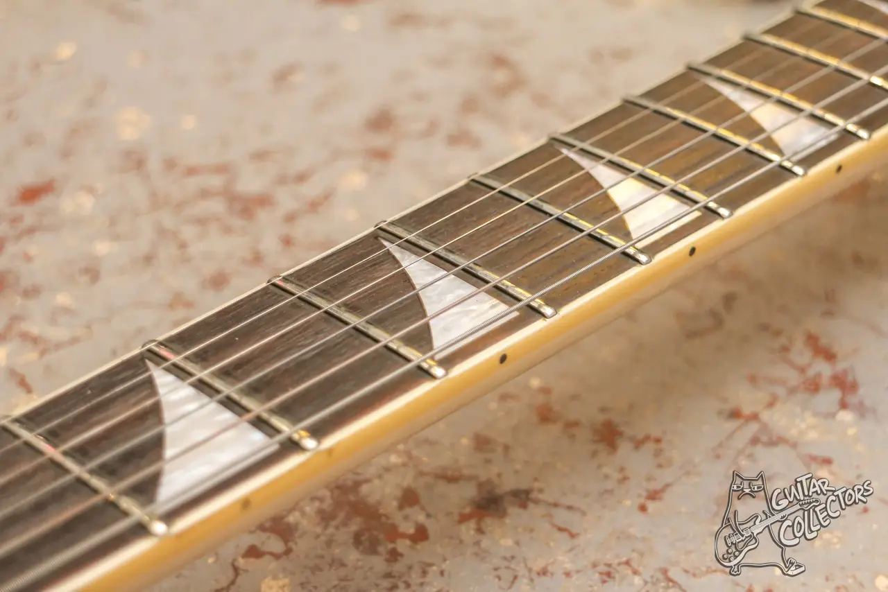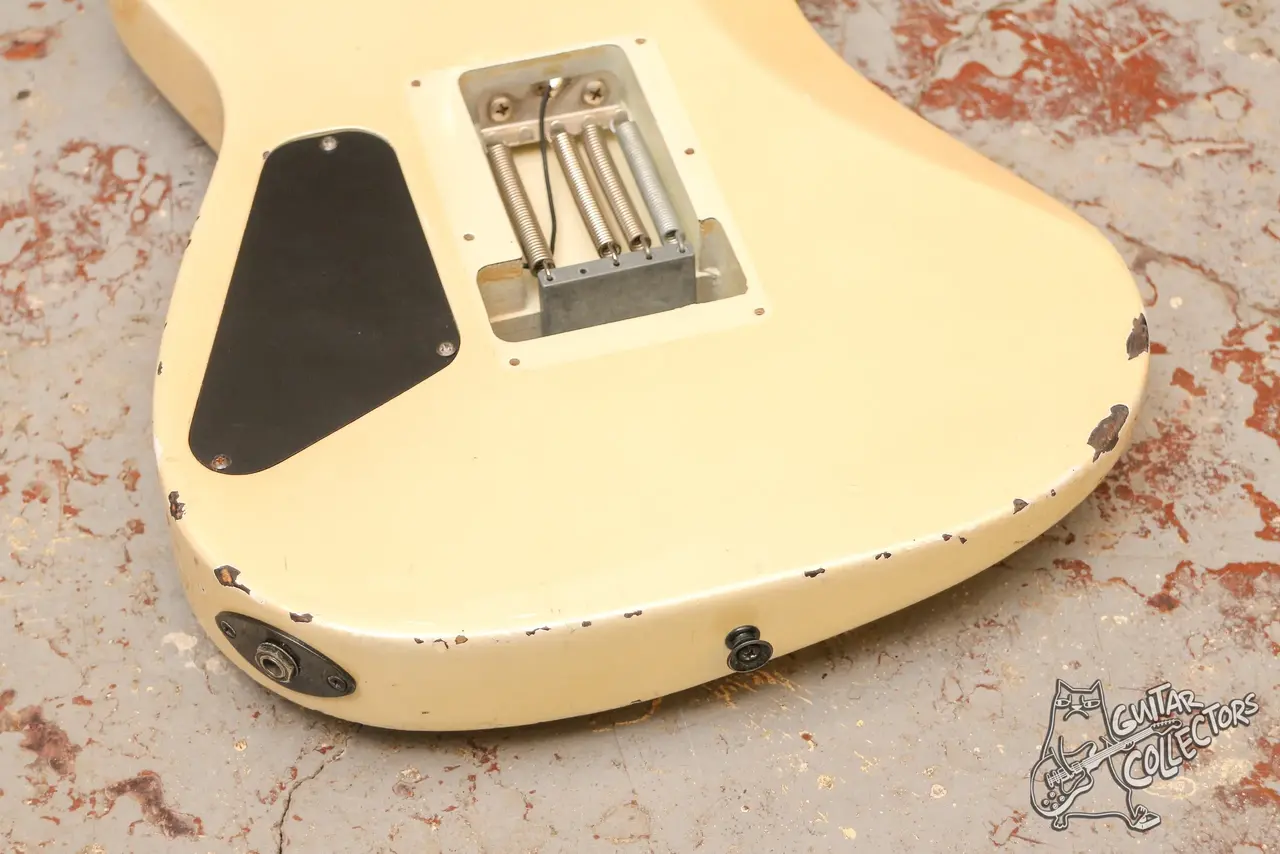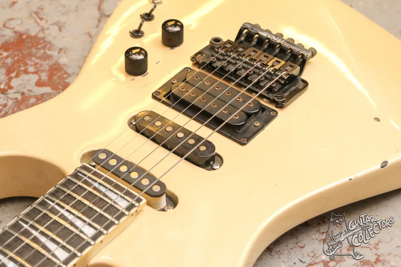 Агрессивный японский суперстрат с HSS конфигурацией, флойдом, кантом по грифу с зубастой инкрустацией и отдельными переключателями вкл\выкл на каждый датчик. Отличная сборка и надежные комплектующие. Технически без проблем, все исправно, совсем недавно были установлены новые лады. Косметически имеется много сколов по лаку, без дела инструмент не лежал, релик исключительно натуральный, также есть трещинка в районе тембрблока, но она опасности не представялет, ремонтов не требует. Нековый датчик заменен на мощный, неопознанный, но точно не китайский сингл. Флойд в этой модели можно опереть на корпус и использовать как стратовское тремоло в одну сторону, это сильно упрощает настройку и замену струн и инструмент крайне надежно держит строй в таком режиме.