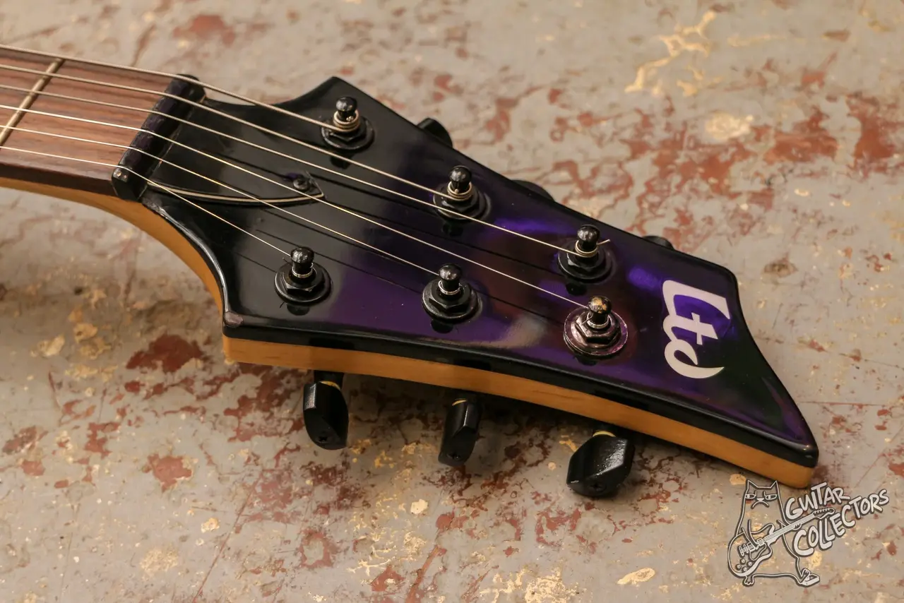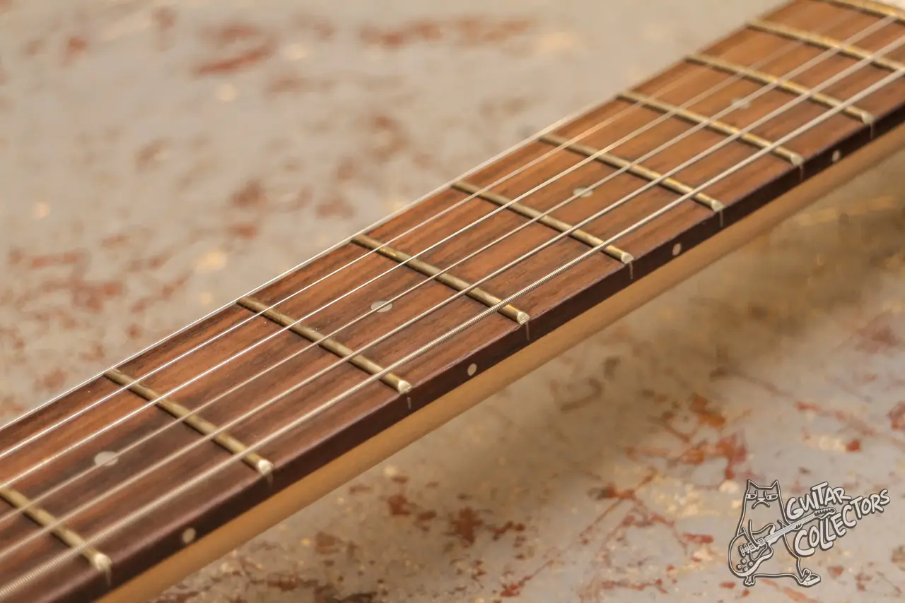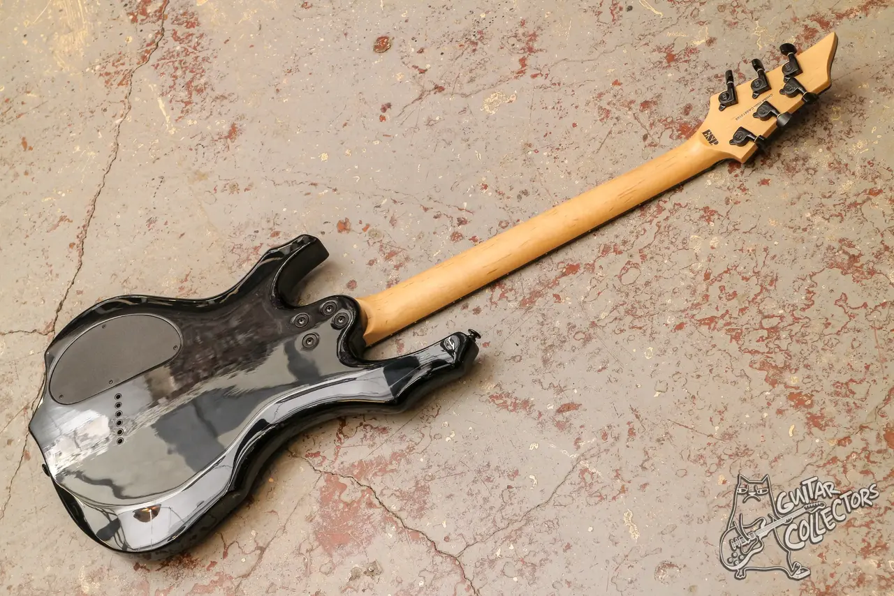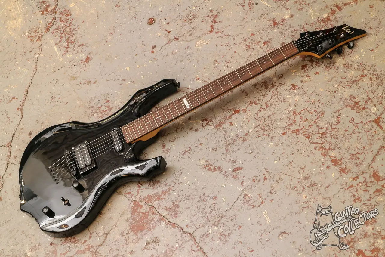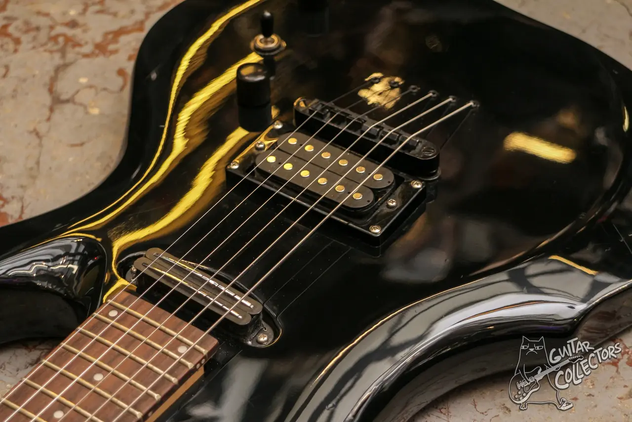 Черный агрессивный суперстат с 24 ладами, парой хамбов и струнами сквозь корпус. Технически в порядке. По косметике без особых происшествий, пара коцек и потретости, в эксплуатации был не много. Датчики заменены на неопознанный хамб в бридже и рельсовый минихамб в неке.