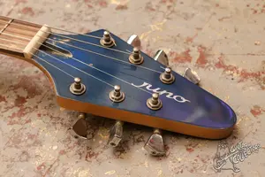 Крайне редкая и тяжелая акриловая стрела. Технически в порядке, гриф ровный, струны низко ,все звучит и строит. Косметически без сколов, только потертости. На корпусе у крепления грифа откололся кусочек через который проходят два болта крепления грифа, но в целом это не критично, все держится при желании его можно подклеить и под некплейтом это не бросается в глаза.