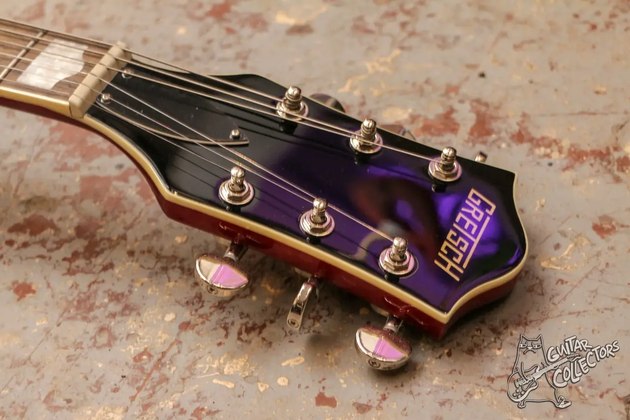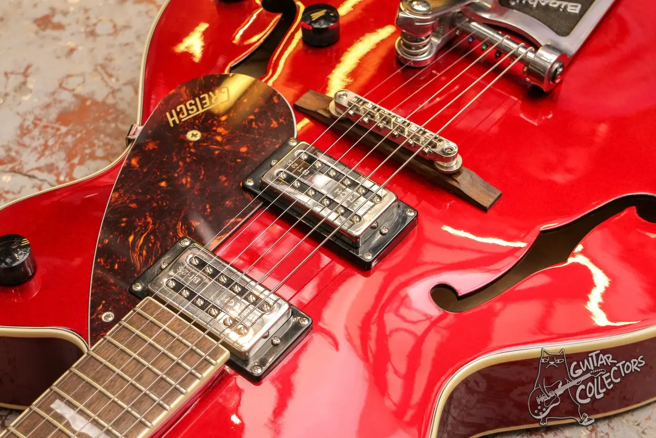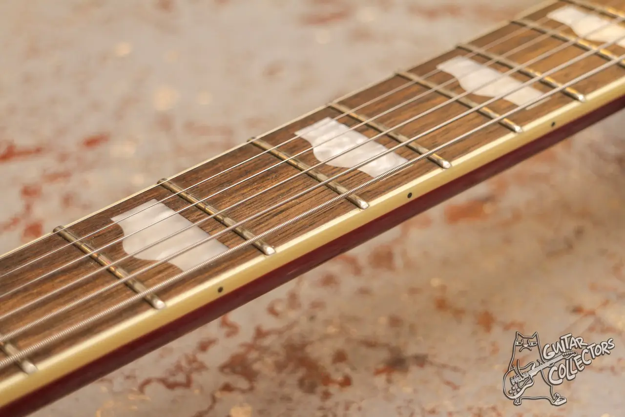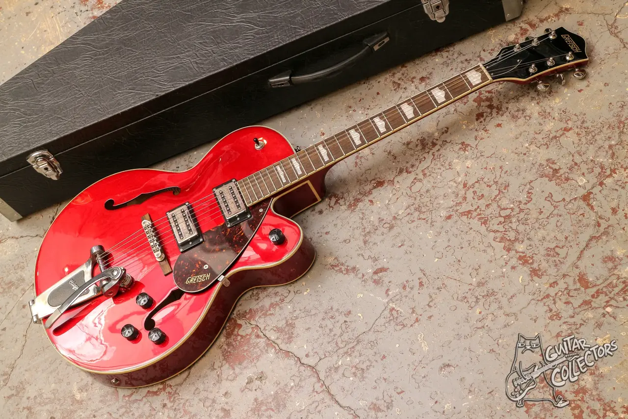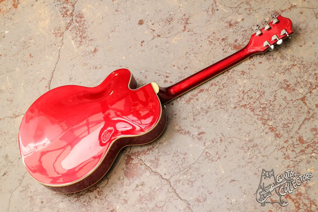 Яркая полуакустика с окантовкой, сетом хамбов Broad’Tron и тремоло бигсби. Состояние очень хорошее, в эксплуатации инструмент практически не был, хранился бережно. Предыдущий владелец сделал кейс специально под эту гитару, кейс в комплекте, невероятно прочный и тяжелый (8.0кг).