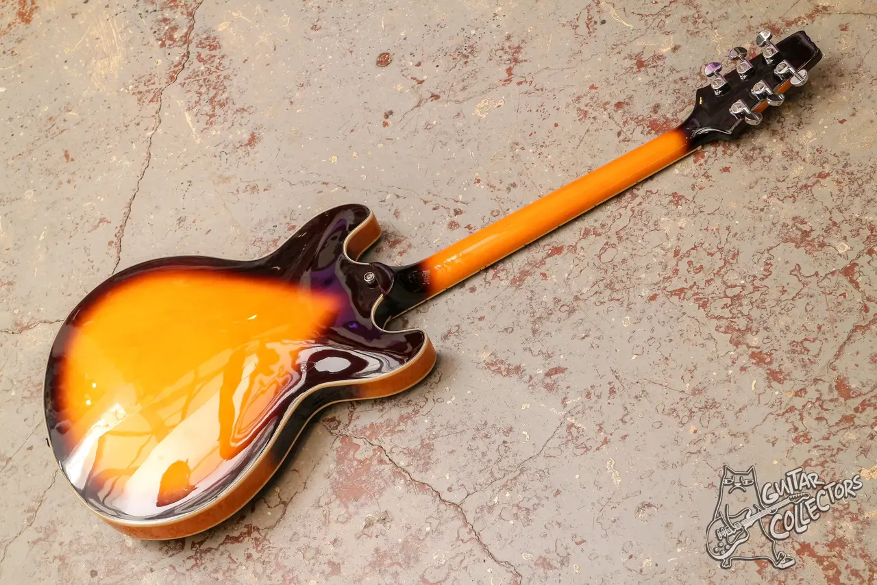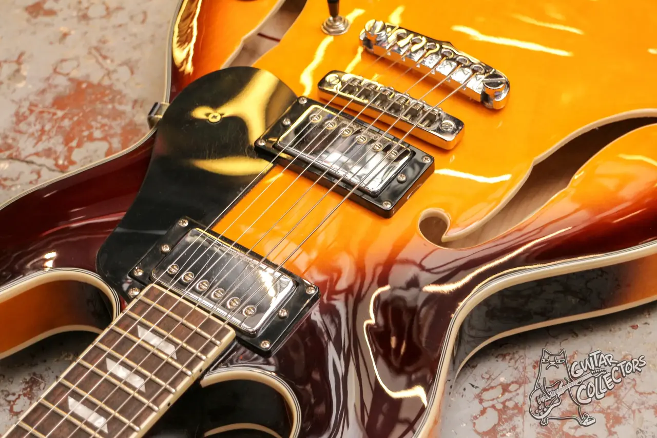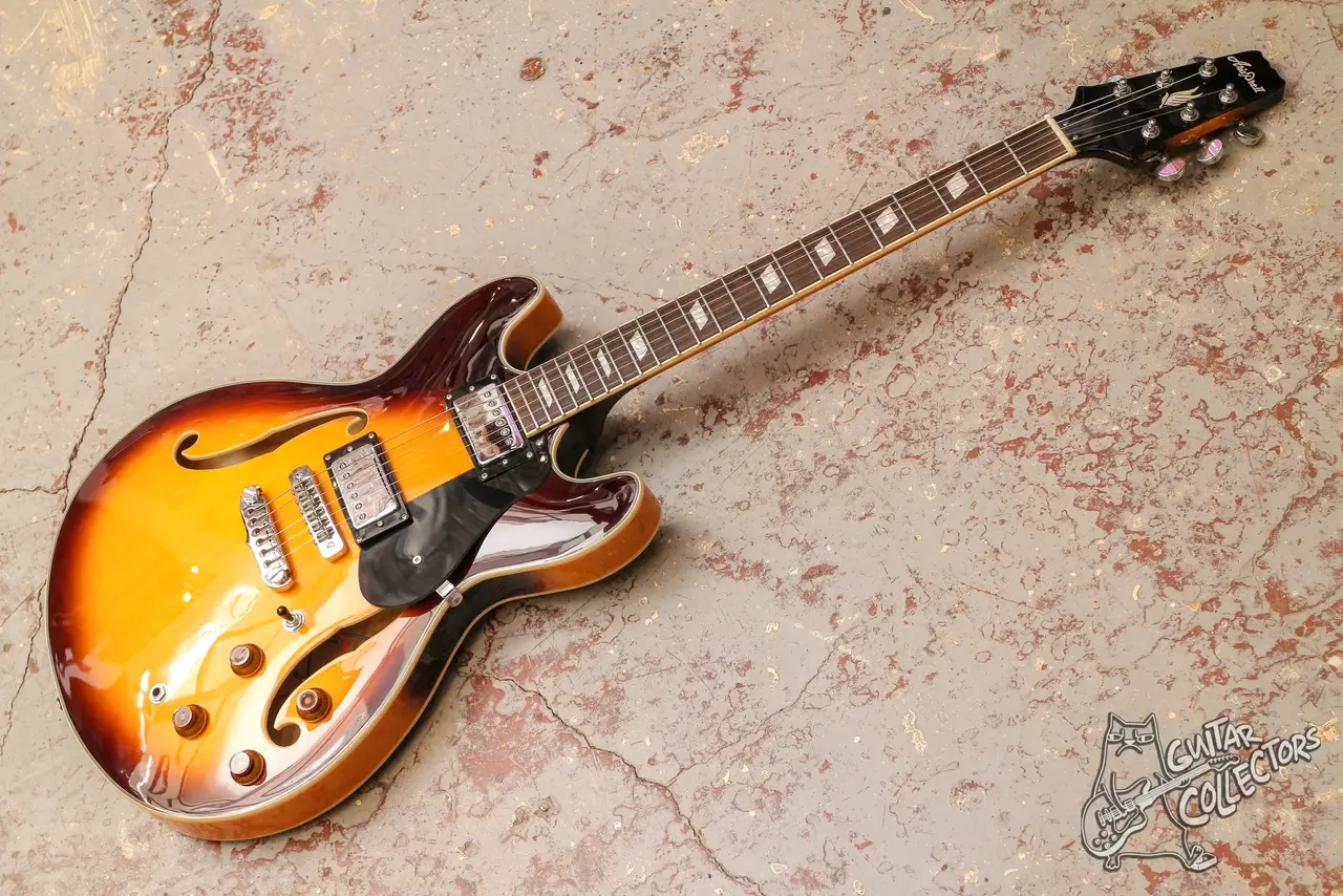Полуакустика с центральным блоком, вклеенным грифом и окантовкой. Технически в полном порядке, гриф ровный, электроника исправна. Косметически есть потертости и трещинки по лкп, без сколов.