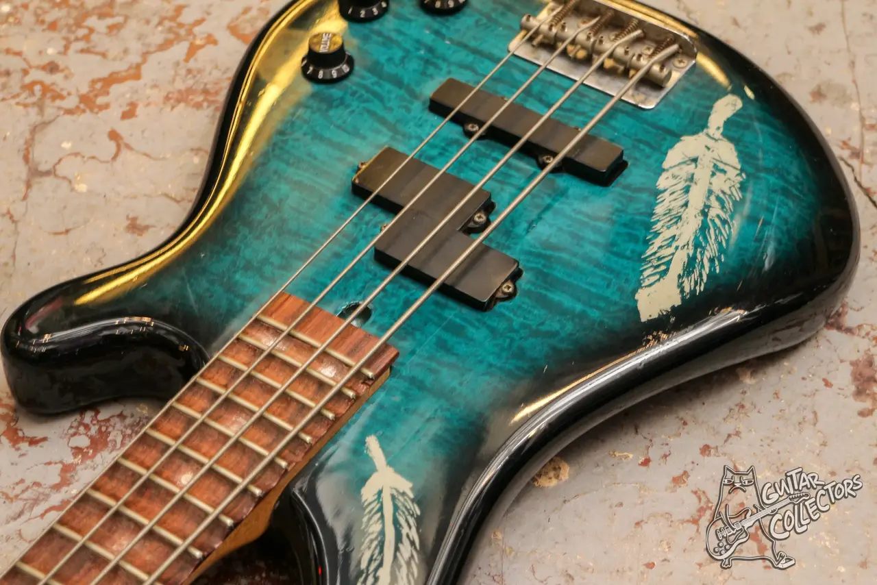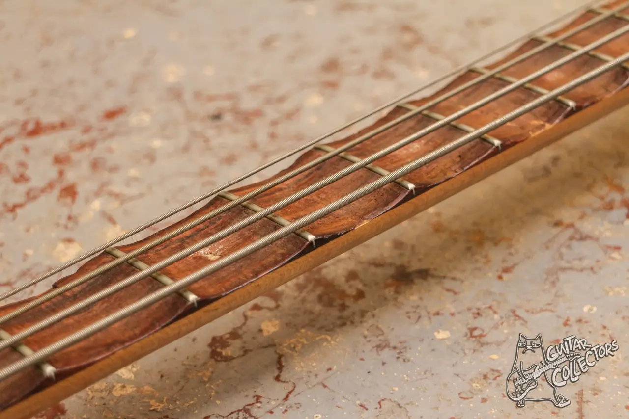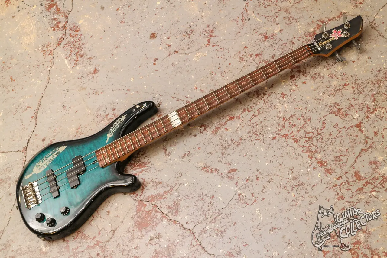 Японский полномернузрный бас из 90х. Состояние технически в порядке, но по косметике есть нюансы, коцки, сколы, наклейки, царапинки. Сделано глубокое и неаккуратное скалопирование накладки, при этом гриф рвоный, по ладам все звучит, струны низко.