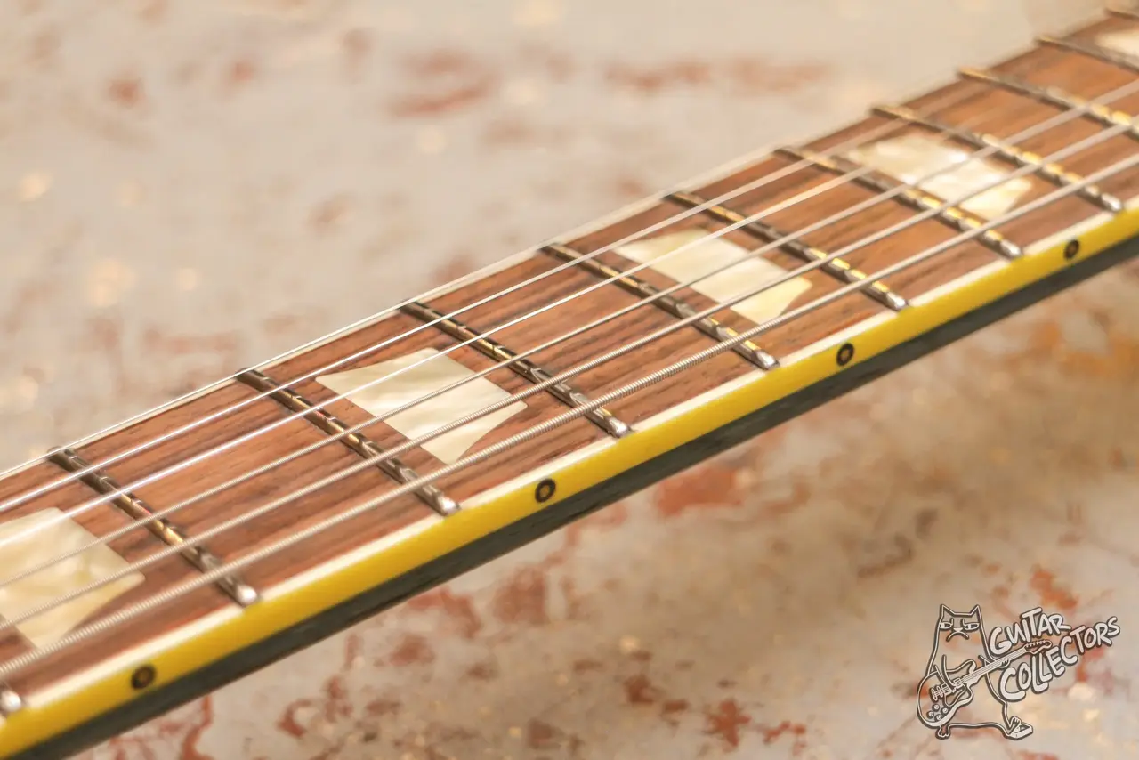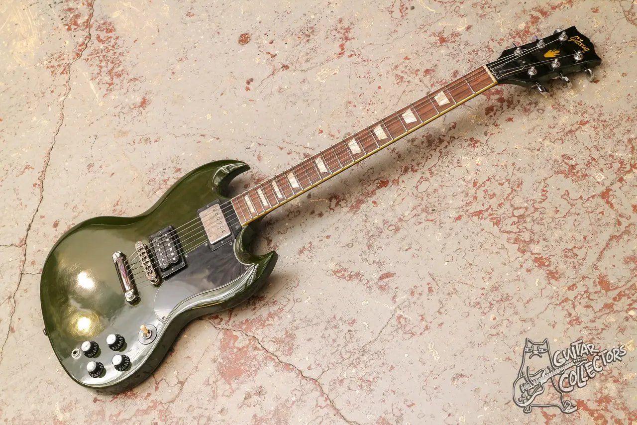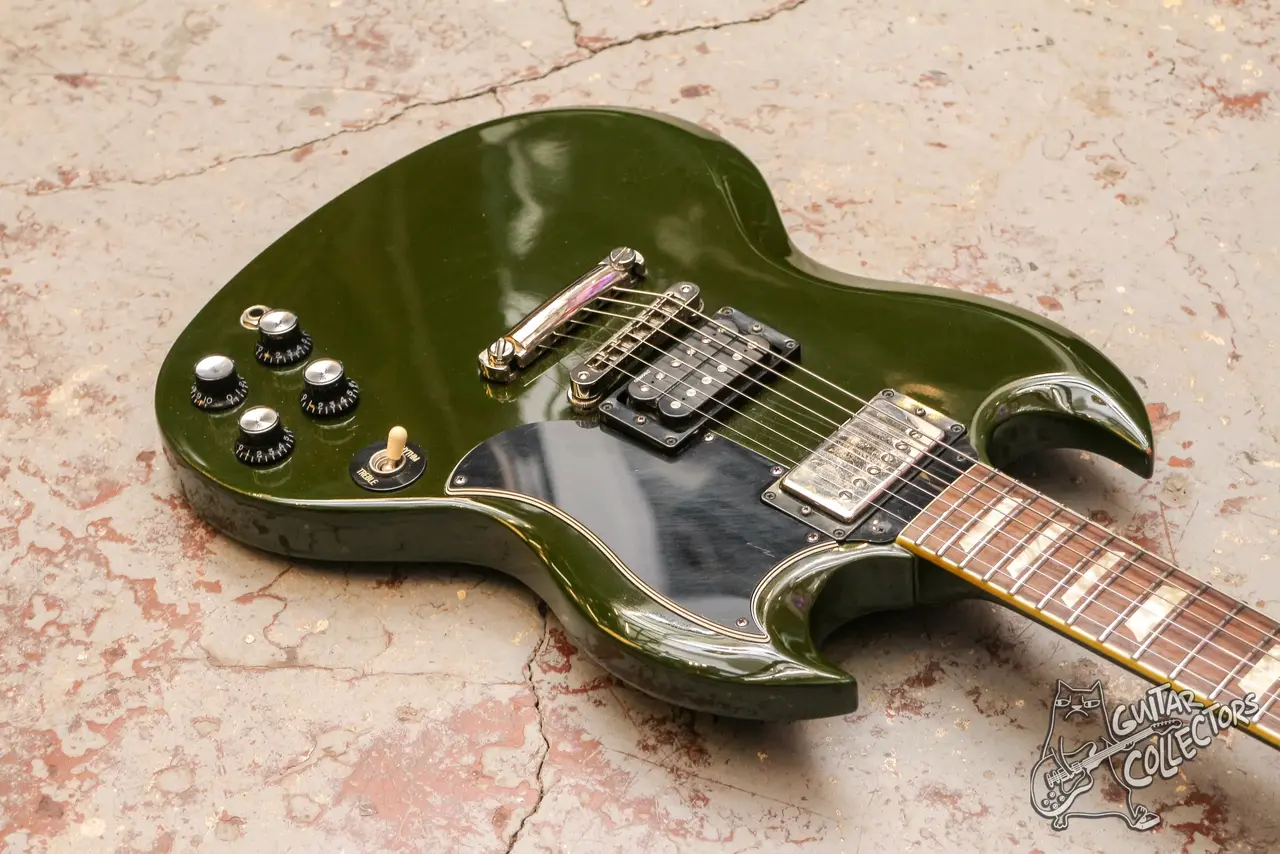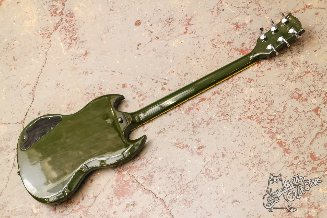 Переиздание модели 1961года с сетом димарзио. Инстрмент был перекрашен в цвет Swamp Green, покрыт нитролаком, сделано аккуратно. Окантовка была заменена на целюлоид вместо пластика, установлены стальные лады. Сама деревяшка от оригинального Гибсона 61 модели, от стандарта ее отличает чуть более широкая голова. Вырез под анкер, то как вставлен гриф под нековым датчиком, как сделана фреза под тембрблок и угол головы, как выбит серийник и приклеены “уши головы”, все точно так как и должно быть на гибсоне. Причина перекраса неизвестна, следов ремонта под лаком не видно, под крышкой анкера также все норм, был ремонт или нет выяснить возможным не представялется. Тембрблок на потенциометрах Gibson и с родным свитчем. Сохрнилось фото серийника до нанесения краски.