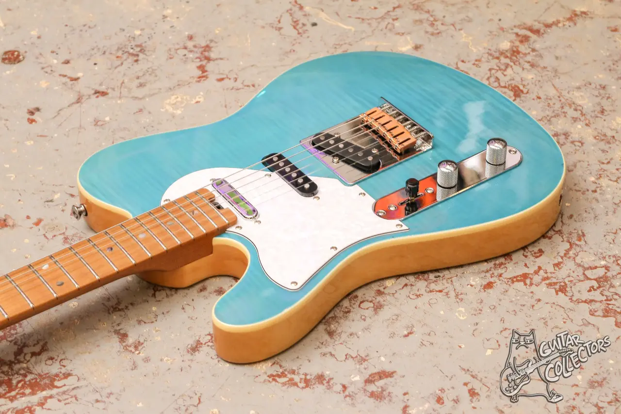 Леворукий телек с тремя синглами, красивым топом, окатновкой и кленовой накладкой. Состояниепрекрасное, в эксплуатации практически не был. Седла на бридже заменены на роликовые, в остальном все сток.