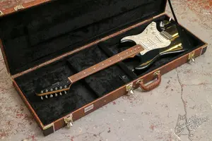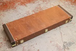 Симпатичный деревянный кейс с обивкой под змеиную кожу. Влезают страты, суперстраты, можно поместить даже ЛП, но будет задевать дно головой.