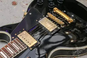 Классический черный кастом с вклеенным грифом, толстой окантовкой и золотой фурнитурой. Строит и звучит, гриф ровный, по ладам все отлично. Косметически без повреждений, свеж и бодр.