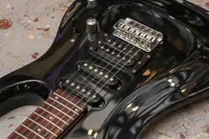 Удобный ольховый суперстрат с HSS набором датчиков, шестиболтовым тремоло и 24 ладами. Технически в порядке, все строит и звучит, гриф ровный, струны низко. Косметически имеется пара сколов по корпусу.