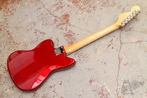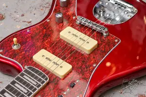 Яркий джазмастер с парой P90, 22 ладами, окантовкой по грифу и инкрустацией прямоугольниками. Технически в полном порядке, сборка адекватная, гриф ровный, анкер работает, звучит, строй держит. По косметике без повреждений, в эксплуатации инструмент практически не был.