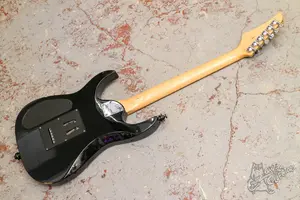 Черный суперстрат с одним рельсовым хамбом.Технически в порядке, гриф ровный, по ладам все звучит вложений не требует. По косметике есть пара маленьких сколов, по дереву без проблем. Установлен пикгард под один хамб и рельсовый керамический хамбакер, звучит адекватно, выглядит стильно. Установлены стреплоки.