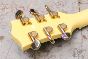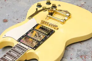 Белый СГ стандарт с кантом по грифу, тремя хамбами и бигсби тремоло.Стильный и красивый инструмент. Технически в полном порядке, по грифу проблем нет. Вложений гитара не требует, звучит, строй держит.