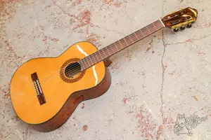 Классическая гитара с топом из массива. Инструмент новый, на складе появилась трещина в верхней деке от перепада влажности. Трещина была надежно заклеена, опасности не представляет. В эксплуатации гитара не была, других повреждений нет, по грифу и ладам все хорошо.