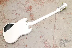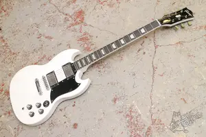 Белый СГ стандарт с кантом по грифу. Копия гибсона. Инструмент в эксплуатации не был. Технически в полном порядке, по грифу проблем нет. Вложений гитара не требует, звучит, строй держит.
