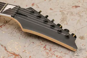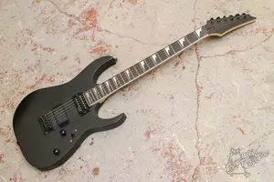 Черный матовый суперстрат со струнами сквозь корпус 24 ладами, кантом по грифу и парой хамбов. Технически все хорошо, строит и звучит. Косметически небольшие потертости и пара вмятинок по лкп. Голова закрашена в черный матовый, нековый датчик заменен на хамбакер schecter, в остальном все сток.
