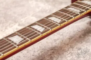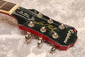 Тяжеленький стандарт с красивым кленовым топом и отсечками на оба хамба. Технически без нареканий, гриф ровный, все родное, все исправно, струны низко, по ладам все звучит. Косметически имеется пара сколов на корпусе. Голова ломалась, заклеена надежно, как и всегда в таких случаях, второй раз в томже месте не сломается, на звук не влияет. В данном случае сломалась она хорошо (ремонтопригодно), не отсеклась ровно поперек, а имеет пртяженность от порожка до колков, а это значит что место ремонта имеет большую площадь контакта, так что все надежно держится.
