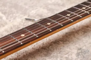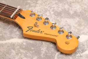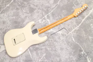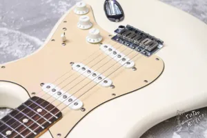 Ольховый мексиканский страт с тремя синглами и шестиболтовым тремоло. Технически все хорошо, струны низко, все звучит и работает. Косметически без сколов, только следы эксплуатации. Бридж заменен, стоит массивное, хорошее тремоло, точную модель опознать не удалось, но оно сильно лучше стокового. Также ритейнер на голове не родной.